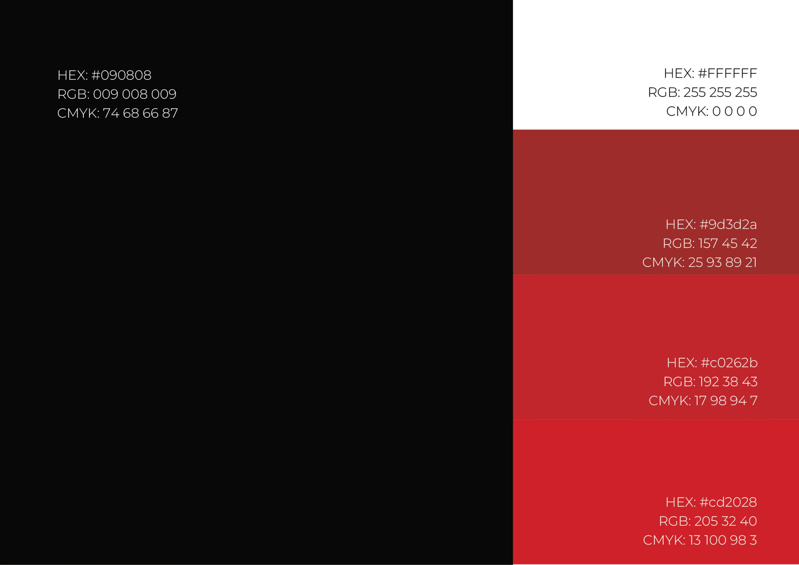 Together, #090808 (Midnight Black) and #C0262B (Crimson Red) create a compelling color system—grounded yet dynamic, disciplined yet expressive—reflecting the dual nature of our studio: creativity with purpose.